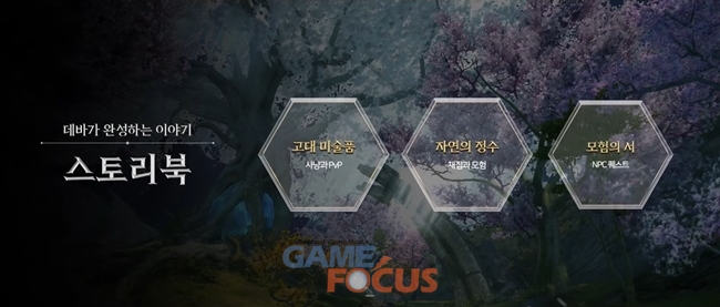 플레이를 통해 이야기 완성 '스토리북'-스토리북은 이용자의 게임 플레이가 하나의 이야기로 완성되는 콘텐츠다. 사냥과 PvP를 통해 완성하는 '고대 미술품', 채집과 모험으로 완성하는 '자연의 정수', NPC 퀘스트를 통해 완성하는 '모험의 서'로 구성되어 있다.