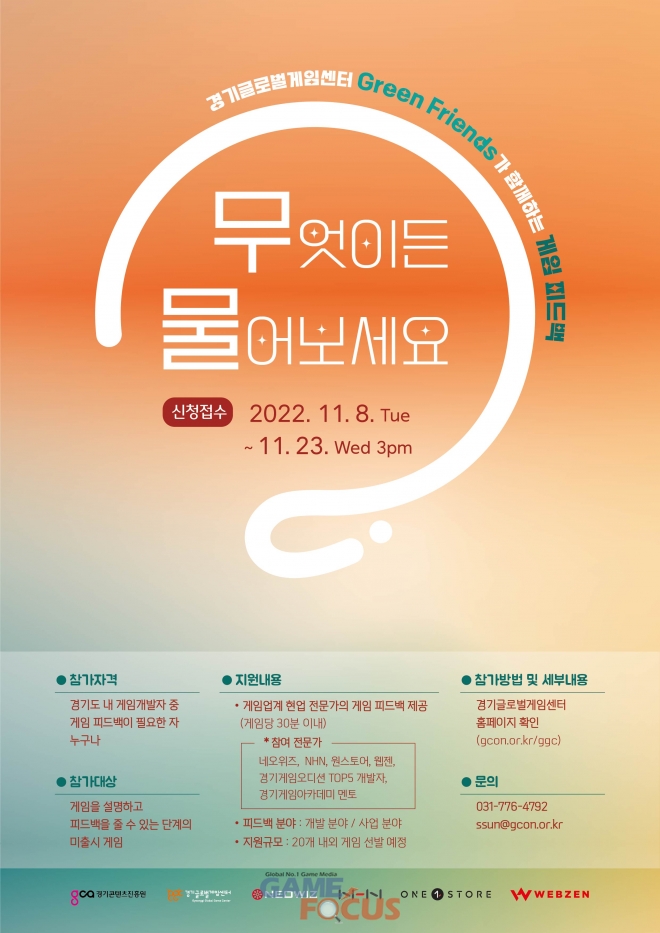 게임 분야 무료 컨설팅 '무엇이든 물어보세요'는 12월 1일 경기도 판교 경기창조경제혁신센터 1층 기가홀에서 진행되며, 경기도 소재 게임 개발자 중에서 게임에 대한 피드백을 받고 싶은 초기 개발자라면 누구나 신청할 수 있다.