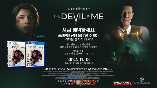 반다이남코 엔터테인먼트 코리아(대표 제랄드 누난)는 PlayStation5, PlayStation4, Xbox Series X|S, Xbox One, STEAM 플랫폼 호러 '더 다크 픽처스 앤솔로지: 더 데빌 인 미'(한국어판)의 선주문을 2022년 11월 11일 실시한다고 발표했다.