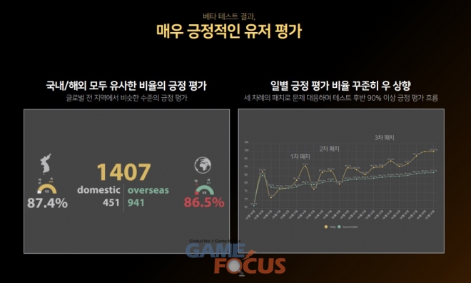 지난 6월 9일부터 26일까지 실시한 스팀 글로벌 베타 테스트에서 얻은 유저 평가와 피드백을 공개했다. 스팀 사용자 평가에서 87%에 달하는 유저들이 게임성을 긍정적으로 평가했으며 이는 국내, 해외 유저 모두 비슷한 수치를 기록했다. 특히, 테스트 기간 중 얻은 피드백으로 세 차례에 걸쳐 패치를 진행하며 긍정 평가 비율이 높아졌다.