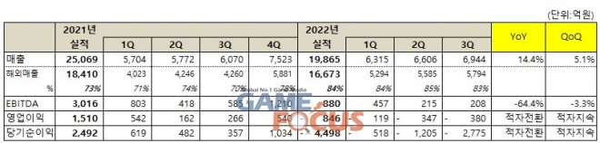 넷마블의 올해 3분기까지 누적 매출은 1조 9,865억원, 누적 EBITDA는 880억원, 누적 영업손실은 846억원으로 집계됐다.