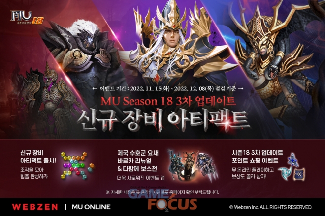 웹젠(대표 김태영)이 PC MMORPG ‘뮤 온라인’의 시즌18 3차 업데이트로 대규모 집단 레이드 ‘다함께 보스전’과 ‘바르카 지역’ 토벌 등 다양한 신규 콘텐츠를 선보인다.