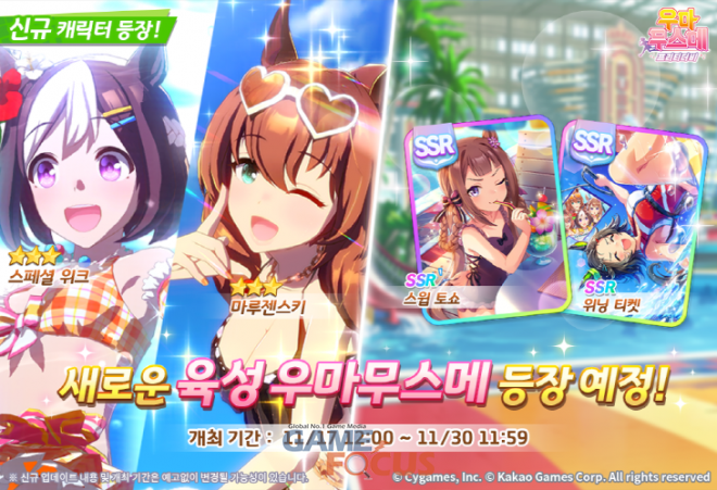 이와 함께, 오는 17일부터 30일까지는 스토리 이벤트 ‘그 아이가 수영복으로 갈아입는다면 우마무스메 여름 이야기’를 개최한다. 이번 이벤트에서 이용자들은 우마무스메의 육성을 통해 이벤트 포인트와 룰렛 코인을 얻고, 한정 스토리 개방, 한정 ‘SSR 서포트 카드’ 등 다양한 보상을 획득할 수 있다.