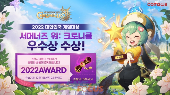 컴투스(대표 송재준, 이주환)는 자사가 개발한 소환형 MMORPG '서머너즈 워: 크로니클(이하 크로니클)'의 2022 대한민국 게임대상 우수상 수상을 기념해 유저 감사 이벤트를 진행한다고 밝혔다.