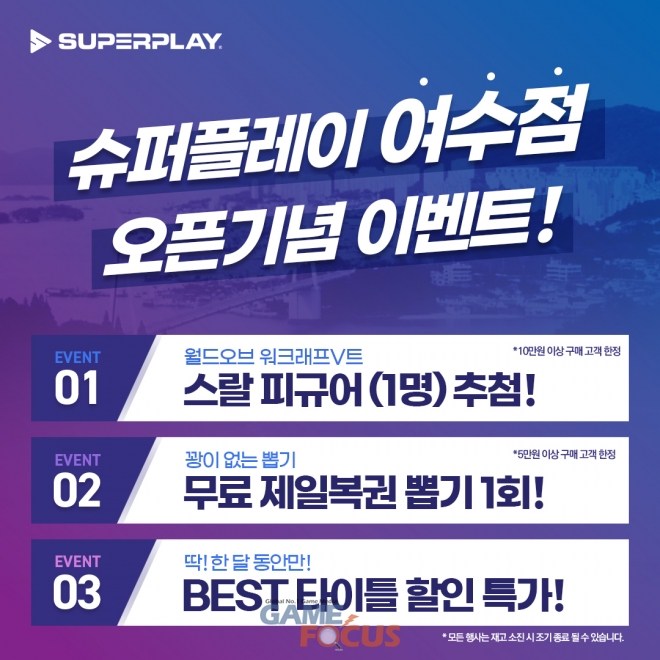 한편, 여수점은 오픈 기념으로 3가지 이벤트를 진행하고 있다. 10만원 이상 구매 고객 중 1명을 추첨하여 90만원 상당의 스랄 피규어를 증정하며 5만원 이상 구매 고객은 꽝이 없는 뽑기인 '동물의 숲 제일복권'을 1회 뽑을 수 있다. 오픈 이후 한 달간 인기가 많은 게임 타이틀을 저렴하게 구매할 수 있는 할인 이벤트도 준비되어 있으며 게임 액세서리도 선착순으로 증정한다고 밝혔다.