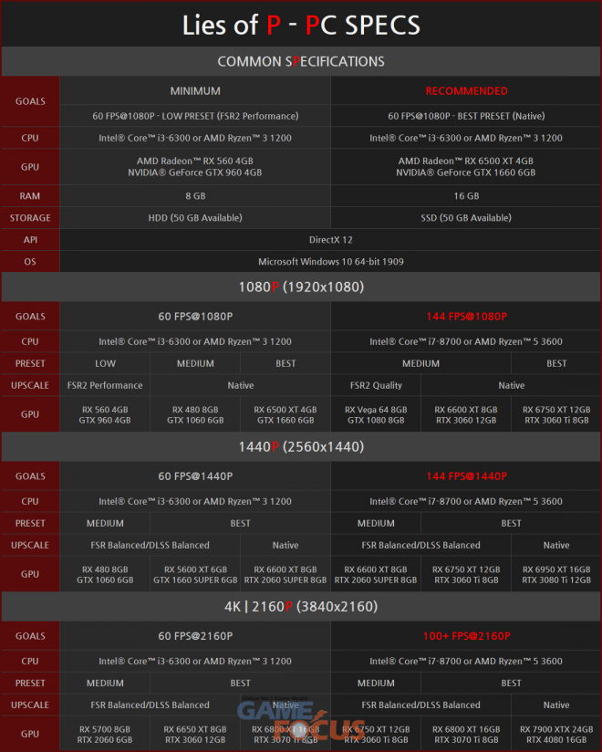 'P의 거짓'의 정식 출시일은 오는 9월 19일로, 플레이스테이션(PS) 4·5, 엑스박스 원(XBOX ONE), 엑스박스 시리즈 X|S(Xbox Series X|S), 그리고 PC 플랫폼 '스팀(Steam)'에서 만나볼 수 있다. 디지털 가격은 스탠다드 에디션 64,800 원, 디럭스 에디션 74,800 원이며, 오프라인에서 구매할 수 있는 공식 패키지 가격은 64,800 원이다. 공식 한정판 가격은 오는 8월 중 공개될 예정이다.