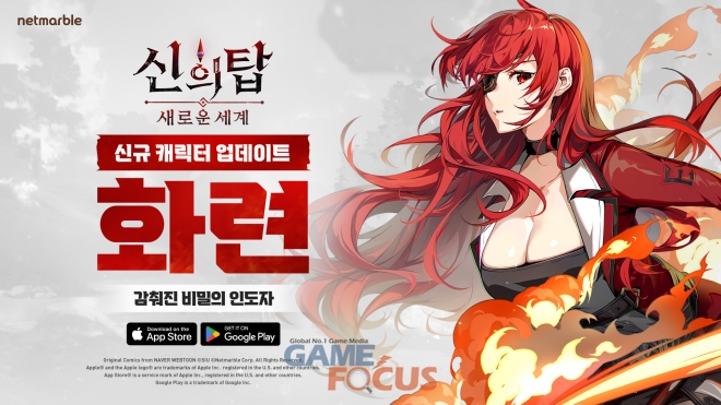 신규 캐릭터 SSR '화련'은 라헬을 지키려는 '스물다섯번 째 밤'에 의해 오른쪽 눈을 잃은 붉은 마녀 종족이다. 일련의 사건으로 밤과 함께 탑에 오르지만, 매사 냉철하고 포커페이스로 속내를 알 수 없는 인물이다. <신의 탑: 새로운 세계>에서 화련은 봉을 이용한 화려하고 강력한 액션으로 적군의 약점을 노려 전투를 유리하게 이끈다.