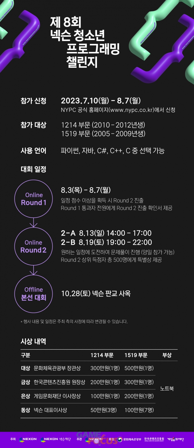 한편 넥슨은 오는 7일까지 전국 초·중·고등학생들에게 NYPC 2023 참가를 독려하고 프로그래밍에 대한 관심을 확대하고자 학교 방문 형식의 신규 캠페인인 'NYPC 스쿨어택'을 진행 중이다.