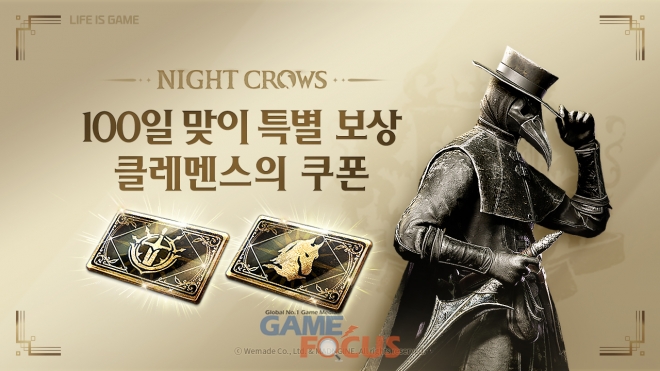 (주)위메이드(대표 장현국)가 서비스하고 매드엔진(공동대표 손면석, 이정욱)에서 개발한 대작 MMORPG <나이트 크로우>가 서비스 100일(8월 4일)을 기념해 '클레멘스의 쿠폰'을 선물한다. 클레멘스의 쿠폰은 탈것, 무기 외형 합성에 재도전할 수 있는 특별 아이템이다.