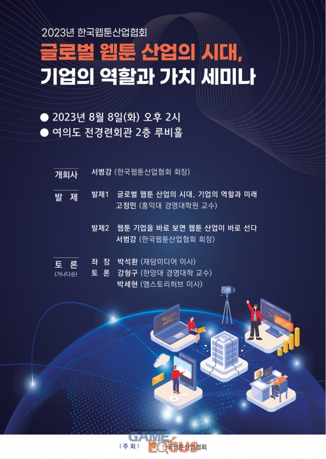 한국웹툰산업협회(회장 서범강)는 8월 8일 14:00에 여의도 전경련회관 2층 루비홀에서 ’글로벌 웹툰 산업의 시대, 기업의 역할과 가치‘를 주제로 세미나를 개최한다.