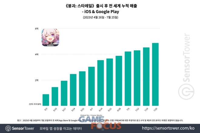 센서타워 스토어 인텔리전스에 따르면, '붕괴: 스타레일'은 출시 후 전 세계 1900만 건 이상의 다운로드와 함께 약 5억 달러의 누적 매출을 달성했다(2023년 4월 26일부터 7월 25일까지 애플 앱스토어와 구글 플레이 스토어 통합 기준).
