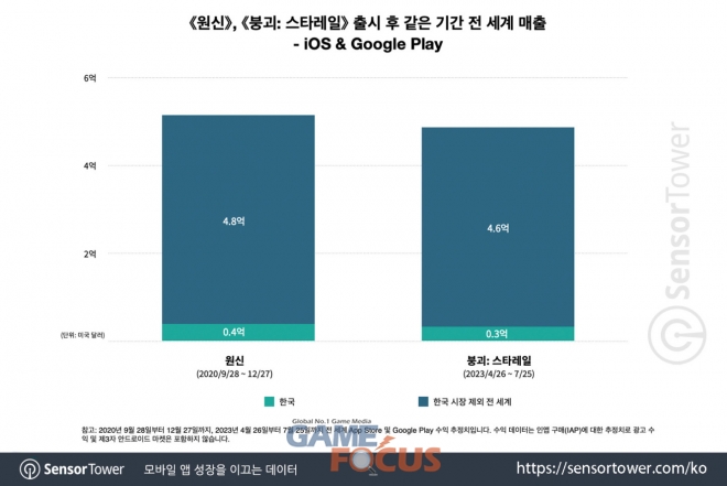 출시 초기 매출에 있어 '붕괴: 스타레일'은 호요버스의 글로벌 히트작인 '원신'과 비슷한 행보를 보이고 있다. 각 타이틀의 글로벌 출시 후 같은 기간 동안 전 세계 매출을 비교해 보면 '원신'은 약 5억 1500만 달러를, 그리고 '붕괴: 스타레일'은 약 4억 9000만 달러를 기록했다. 한국 시장에서도 '원신'은 약 4000만 달러, '붕괴: 스타레일'은 3300만 달러의 매출을 달성했다.