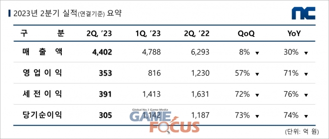 (주)엔씨소프트(대표 김택진)가 2023년 2분기 실적 결산(연결기준) 결과 매출 4,402억 원, 영업이익 353억 원, 당기순이익 305억 원을 기록했다.