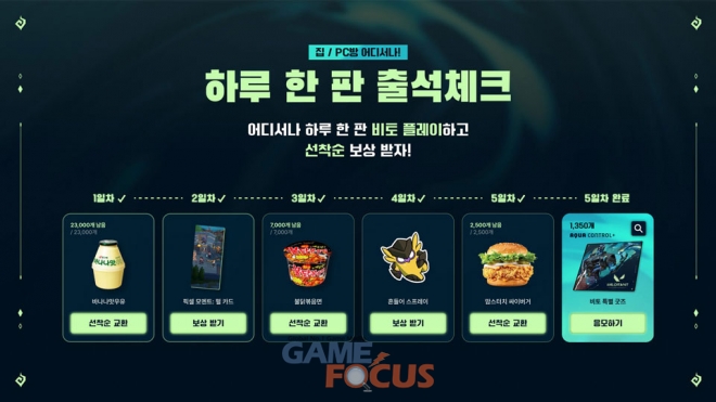 비토의 출시를 기념해 오는 28일(일)까지 ‘비토 출석체크 이벤트’가 진행된다. 이번 이벤트는 집이나 PC방 어디서든 하루 한 번만 플레이하면 참여가 가능하며 일반전, 경쟁전, 신속 플레이 모드에서 모두 참여할 수 있다. 이벤트 참여자들은 누적 출석 일수에 따라 다양한 선착순 보상을 받을 수 있다. 특히 PC방에서 참여 시 최대 120개의 레디어나이트 포인트를 추가로 획득할 수 있으며 비토 출시를 기념한 한정판 굿즈와 게임 내 아이템 쿠폰, 게이밍 기어등 풍성한 보상이 준비되어 있다.