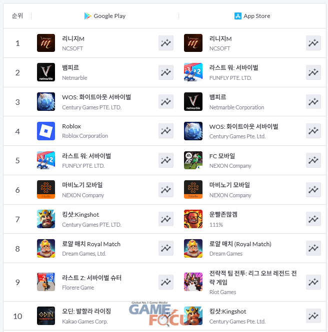 애플 앱스토어에서는 '리니지M'이 선두를 달리는 가운데 '라스트 워: 서바이벌', '뱀피르', '화이트아웃 서바이벌', 'FC모바일' 등이 TOP 5를 형성하고 있다. '마비노기 모바일'은 구글 플레이 매출 1위를 기록하며 동시에 애플 앱스토어에서도 2위를 기록하는 등 순항하고 있다.