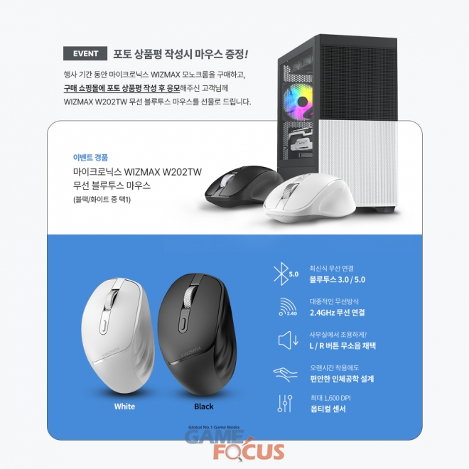 또한 10월 22일부터 11월 23일까지 출시 기념 사은 행사를 진행한다. 행사 기간 동안 제품 구매 후 포토 상품평을 작성한 고객에게는 WIZMAX W202TW 무선 블루투스 마우스가 증정되며, 색상은 블랙과 화이트 중 선택할 수 있다.