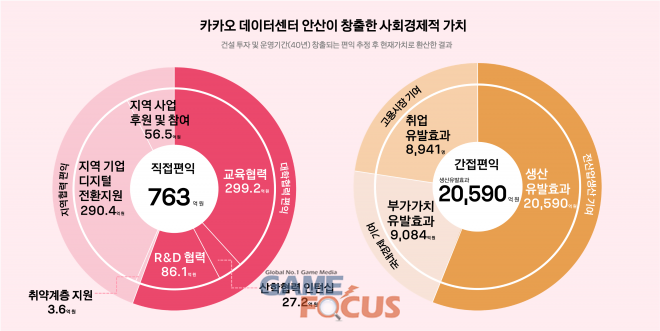 이번 연구에 따르면 카카오 데이터센터 안산은 향후 40년의 운영 기간 동안 직접편익 763억과 생산유발효과 2조 590억 원, 이로 인한 부가가치유발효과 9,084억 원, 취업유발효과 8,941명에 달하는 간접편익을 창출할 것으로 분석됐다.