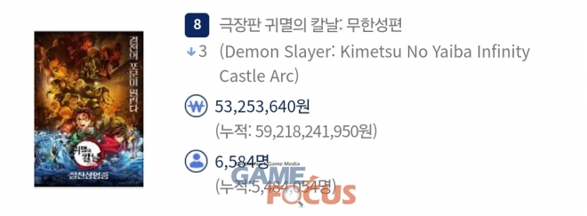 개봉 10주차에도 식지 않는 흥행 열기를 이어가고 있는 < 극장판 귀멸의 칼날: 무한성편>이 누적 관객 수 548만 명, 매출액 592억 원을 달성하며 매출액 기준 역대 일본 애니메이션 흥행 1위 <스즈메의 문단속>(573억 원)의 기록을 넘어섰다.