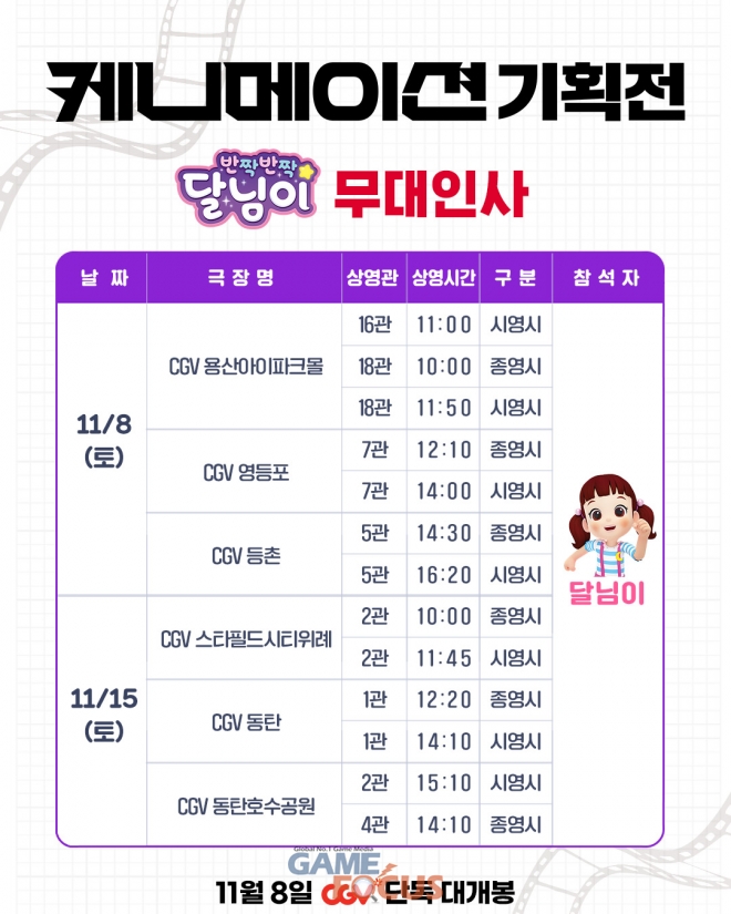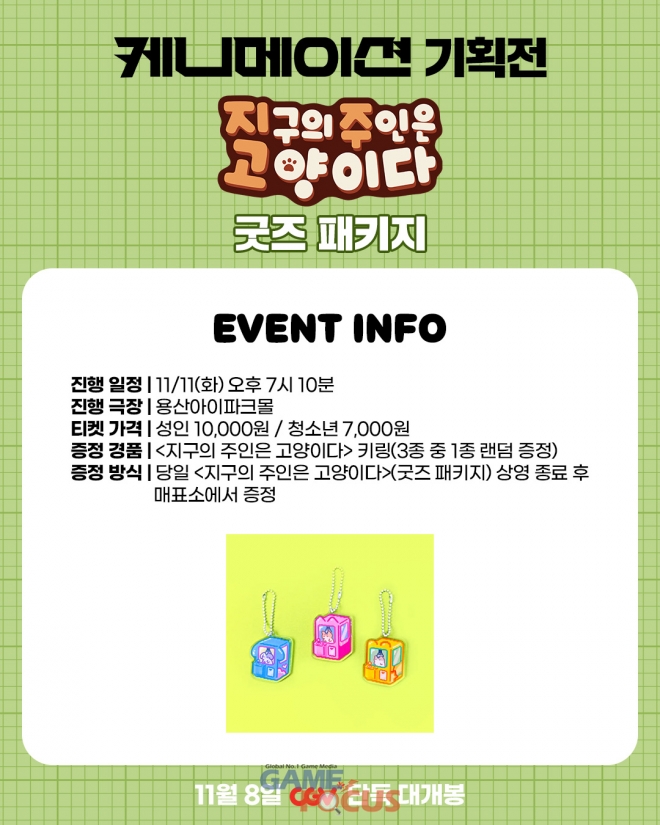 이어 상영작 굿즈를 소장할 수 있는 굿즈 패키지도 진행을 확정해 예비 관객들의 기대를 모은다. 굿즈 패키지 회차에 해당하는 상영작을 관람한 관객 전원에게는 작품별 특별한 굿즈가 증정된다. <반짝반짝 달님이>의 ‘달토끼 키링’은 11월 9일(일) 오전 11시 CGV 동탄에서, <도토리 문화센터: Part1 고두리, 취미 지옥에 빠지다> ‘100일 취미 챌린지 체크판 & 스티커 세트’는 11월 10일(월) 오후 7시 20분 CGV 용산아이파크몰에서, <지구의 주인은 고양이다>의 ‘키링(3종 중 1종 랜덤 증정)’은 11월 11일(화) 오후 7시 10분 CGV 용산아이파크몰에서 상영되는 회차 관람 시 상영 종료 후 매표소에서 수령할 수 있다. 이벤트와 관련한 자세한 내용은 CGV 공식 홈페이지 및 모바일 앱에서 확인할 수 있다.