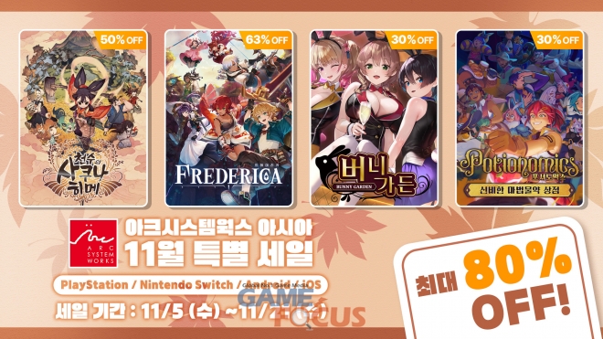 아크시스템웍스 아시아는 PlayStation™Store와 Nintendo Switch™ 및 Google Play와 App Store에서 11월 특별 세일이 진행된다고 발표하며, 「천수의 사쿠나히메」를 비롯하여 다양한 PlayStation®4, PlayStation®5, Nintendo Switch™, Android, iOS 다운로드 타이틀의 세일 정보를 공개했다.