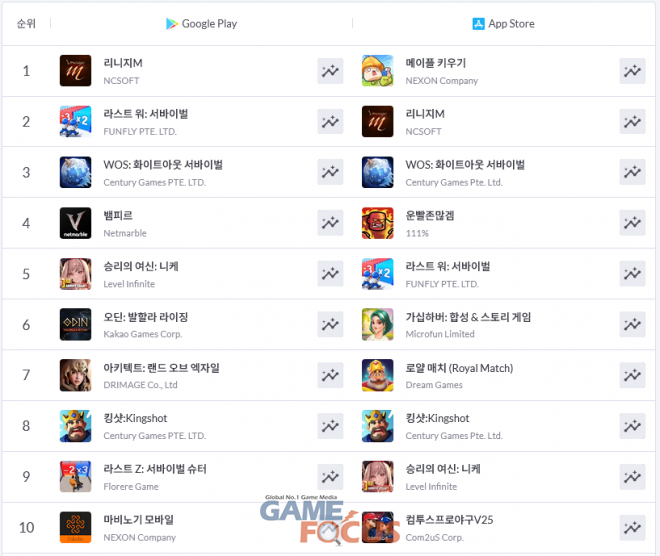 '오딘: 발할라 라이징'과 '아키텍트: 랜드 오브 엑자일' 등 MMORPG들도 상위권에서 순항하는 한편, '마비노기 모바일'은 10위를 유지하며 TOP 10 자리를 지키고 있다. '킹샷'과 '라스트 Z: 서바이벌 슈터' 등의 게임들도 각각 8위, 9위로 TOP 10 내에 이름을 올렸다.