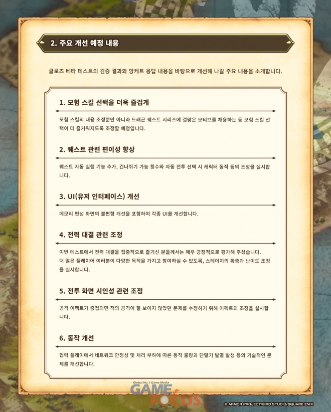 정식 출시 버전에서는 ‘드래곤 퀘스트’ 시리즈다운 요소를 한층 강화시켜 ‘모험 스킬’ 선택에 전략적 재미를 더하고, 퀘스트 자동 실행 기능과 스킵 횟수 조정, 자동 전투 시 캐릭터 모션 개선 등 테스트를 통해 접수된 피드백을 적극 반영하여 게임 완성도를 높이고 보다 쾌적한 환경을 제공할 예정이다.