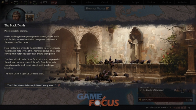 ●흑사병: 최악의 재앙은 나라에 급진적인 정치적 사회적 변화를 일으키며, 이는 플레이어의 권위를 약화시킬 수 있다. 플레이어의 자리를 노리는 기회주의적인 정적의 도전에 맞서서 승리하라.
