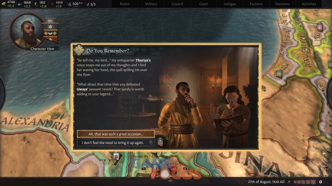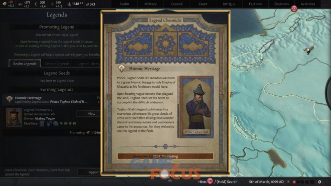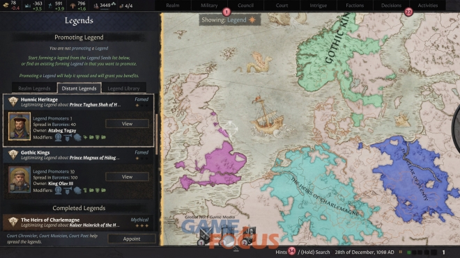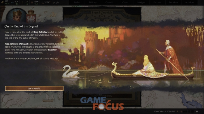 ●전설: 가문의 서사를 널리 알리도록 타인에게 의뢰하거나, 자신이 직접 위업을 쌓아서 명성을 떨쳐라. 그리고 그 서사시가 이후의 시대에 어떠한 영향을 일으키며, 자신의 왕국이 후대에는 어떻게 인식되는지를 직접 보아라.