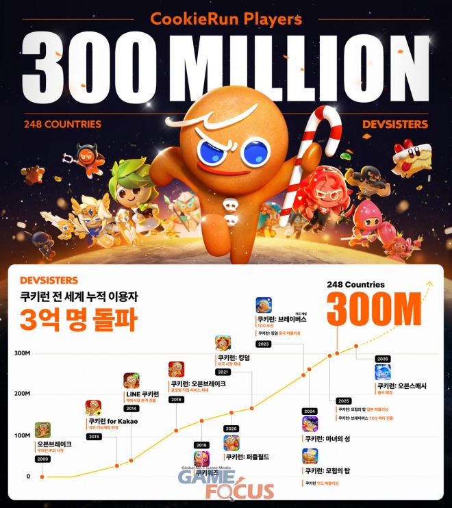 데브시스터즈(주)(대표 조길현)는 자사 대표 브랜드인 ‘쿠키런’이 IP 통합 전 세계 248개국 3억 명 이상의 누적 이용자 수를 기록하며 독보적인 팬덤을 보유한 글로벌 IP로 성장했다고 26일 밝혔다.