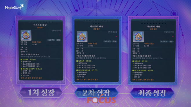 다음으로 신규 장비 아스트라 보조무기 추가도 공개됐다. 제네시스 무기 퀘스트 완료 후 그란디스 지역의 보스를 퇴치하면 얻을 수 있는 '격전의 흔적'과 고난이도 보스 몬스터 퇴치나 그란디스 일일 퀘스트를 통해 획득할 수 있는 '에리온의 조각'을 모아 성장시킬 수 있는 보조무기로, 3단계에 걸친 성장 단계에 따라 강화 가능한 스타포스 수치를 확대할 수 있다. 더불어, 기존 보유하고 있는 보조무기의 잠재능력을 전승할 수 있다.