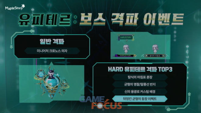 유니온 레벨 1만 이상 달성, 295레벨 이상 캐릭터 보유, 유니온 챔피언 S등급 이상 캐릭터 3개 이상 등록 등 정해진 조건의 다양한 기록을 보유한 이용자도 한데 모인 가운데, 공통점을 보유한 이용자끼리 모여 앉은 3개의 관 사이를 김창섭 디렉터와 성승헌 MC가 이동하며 각 관에 적합한 겨울 대규모 업데이트를 발표했다.
