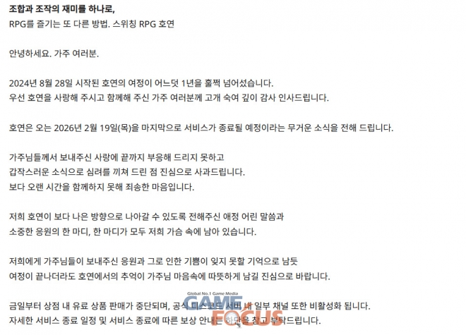 엔씨소프트는 공지를 통해 “유저분들의 사랑에 끝까지 부응하지 못하고 갑작스러운 (서비스 종료) 소식으로 심려를 끼쳐 드린 점 진심으로 사과 드린다. 보다 오랜 시간을 함께하지 못해 죄송한 마음”이라며 “호연이 보다 나은 방향으로 나아갈 수 있도록 전해주신 애정 어린 말씀과 소중한 응원의 한 마디, 한 마디가 모두 가슴 속에 남아 있다. 우리에게 유저들이 보내주신 응원과 그로 인한 기쁨이 잊지 못할 기억으로 남았 듯, 여정이 끝나더라도 호연에서의 추억이 유저들 마음 속에 따뜻하게 남길 진심으로 바란다”라고 전했다.