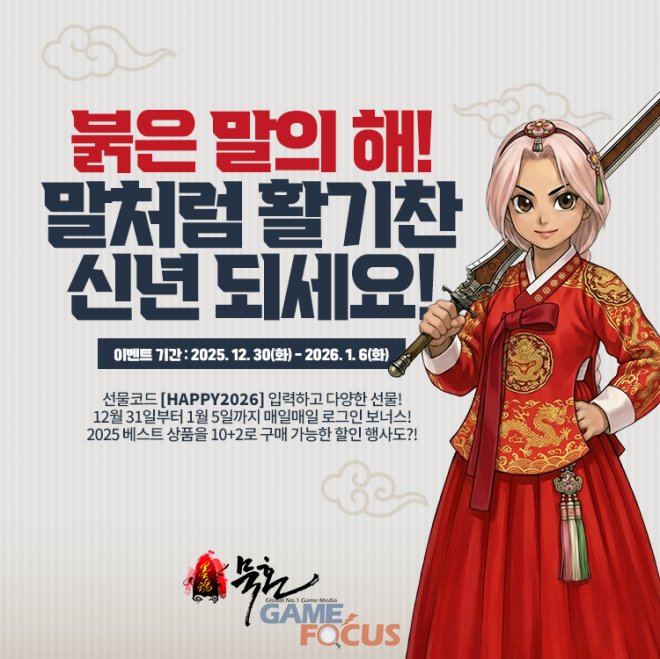 병오년 붉은 말의 해인 2026년을 맞아 진행되는 이번 이벤트는 선물 코드 보상과 일일 로그인 혜택으로 구성된다. 마을 내 수행 안내인 NPC에게 선물 코드 [HAPPY2026]을 입력하면 희영신년(喜迎新年) 칭호를 비롯해 은화, 은원보가 무작위로 제공되는 '신년 용돈 봉투' 등을 받을 수 있으며, 12월 31일(수)부터 1월 5일(월)까지는 매일 로그인을 할 때마다 다량의 신년 용돈 봉투 및 룬 재료가 지급된다.