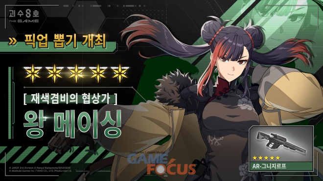 ★5 [재색겸비의 협상가] 왕 메이싱 출현을 기념한 픽업 뽑기도 실시된다. 해당 픽업 뽑기 이벤트 기간 ★5 [재색겸비의 협상가] 왕 메이싱과 전용 무기인 ★5 돌격 소총 ‘AR-그니지르프’의 획득 확률이 대폭 상승한다.
