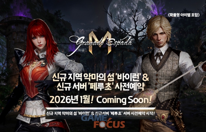그라나도 에스파다M는 '바이런 섬'과 ‘페루초’ 서버 2026년 1월 중 업데이트 예정이며, 사전예약은 업데이트 전까지 공식 홈페이지에서 신청할 수 있다.