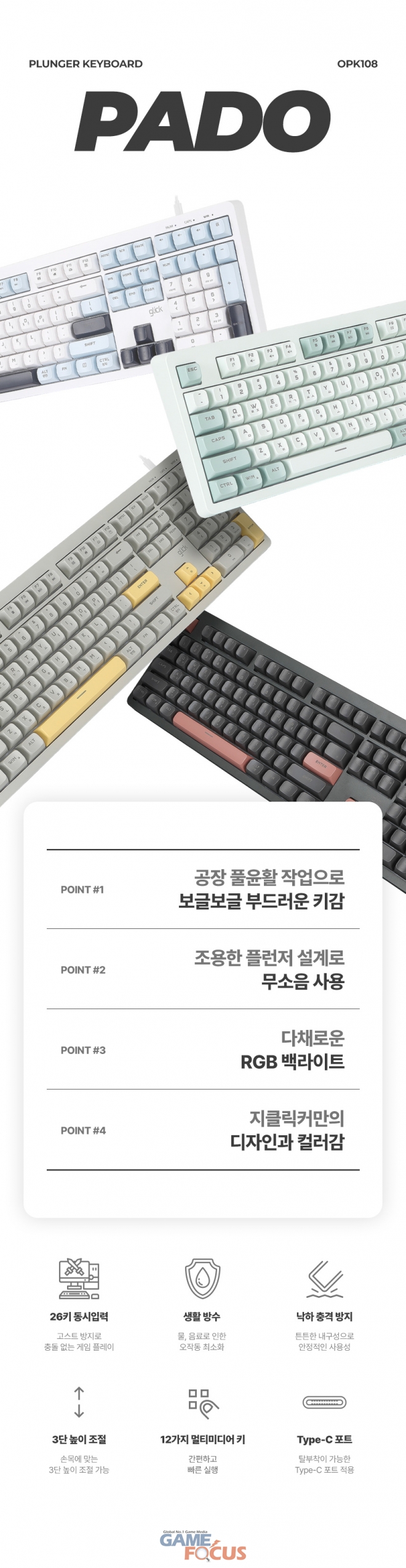 지클릭커(g-clicker)가 감각적인 디자인과 정숙한 타건감을 동시에 잡은 신제품 **‘지클릭커 제주바다 풀윤활 플런저 무소음 방수 유선 키보드 OPK108’을 선보인다고 밝혔다.