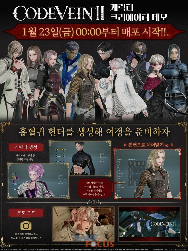 캐릭터 크리에이터 데모에서는 '코드 베인 Ⅱ'의 캐릭터 커스터마이즈와 포토 모드를 체험할 수 있다. 이상적인 흡혈귀 헌터를 생성해 여정을 준비하고, 캐릭터를 생성하고 나서 마그멜 섬의 거점을 돌아다닌다. 또한, 저장한 캐릭터는 '코드 베인 Ⅱ' 본편으로 이어받을 수 있다.