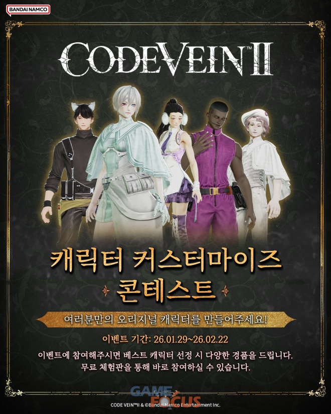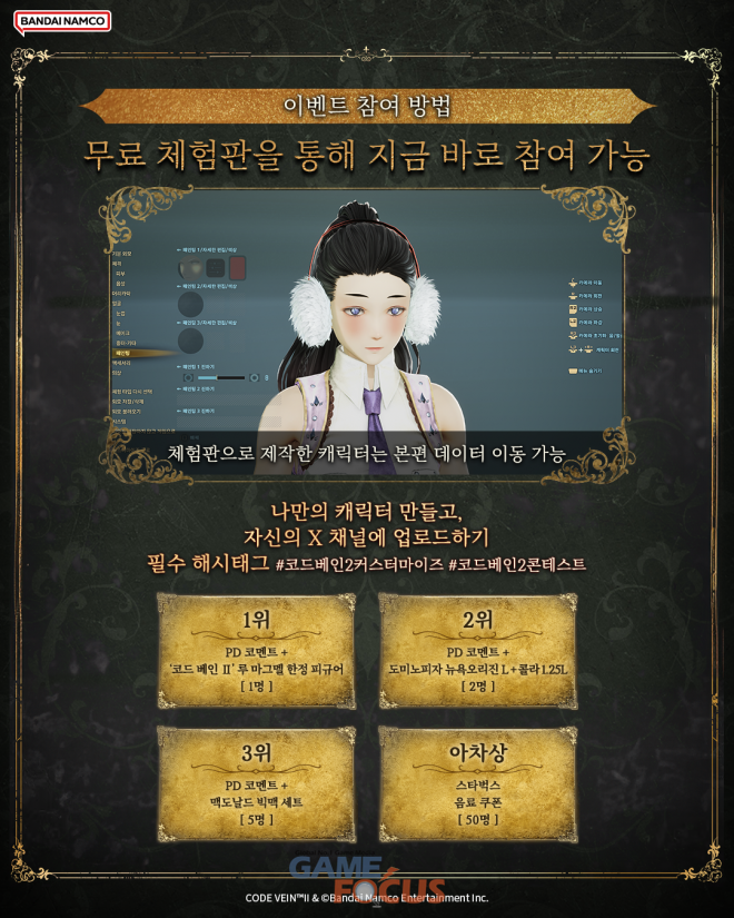 ‘코드 베인 Ⅱ’의 발매를 기념해, 반다이남코 엔터테인먼트 코리아의 X 채널(https://x.com/BandaiNamcoKR)에서 캐릭터 커스터마이즈 콘테스트를 진행한다.