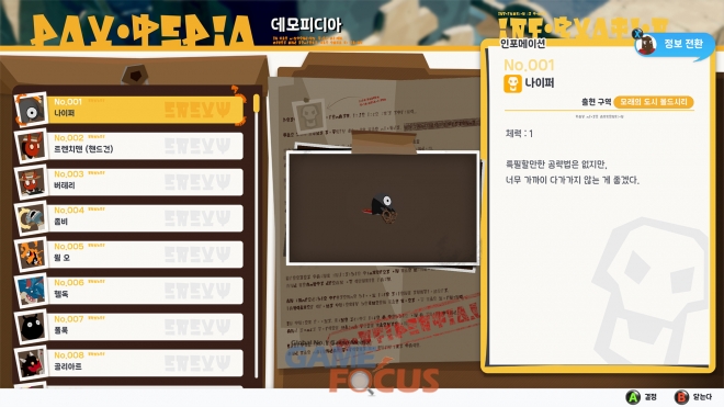 단순한 '색깔 바꾸기'가 아닌, 개성 넘치고 풍부한 기믹으로 무장한 80종 이상의 적 캐릭터가 등장한다. 보물상자나 아이템으로 위장한 적부터 파괴해도 스스로 재생하는 기믹까지, 다채로운 전투를 즐길 수 있다. 적에 대한 정보가 실린 ‘데모피디아’에서는 적의 이름은 물론, 생태와 같은 다양한 데이터가 망라되어 있다.