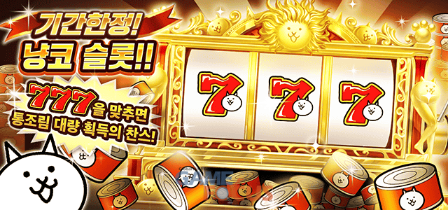 슬롯을 돌려 같은 그림을 맞추면 고양이 통조림을 최소 777개 이상 획득할 수 있는 ‘냥코 슬롯’이 등장한다. 냥코 슬롯은 고양이 기지의 ‘냥코 슬롯’ 버튼을 눌러 시도할 수 있다.