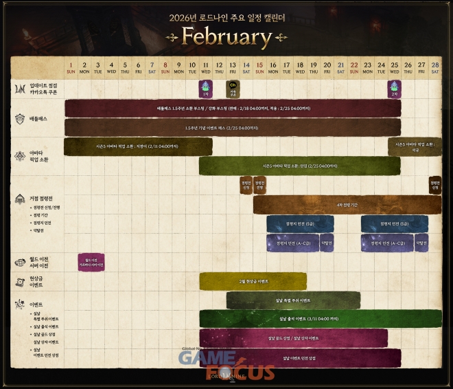 이번에 공개된 로드나인의 2월 캘린더에는 1.5주년 기념 배틀패스 2종과 지팡이, 단검 등의 아바타 픽업 기간, 4차 거점 점령전 등의 중요 이벤트와 콘텐츠 일정이 담겨 있다. 또한, 월드 서버 이전, 설날을 기념한 각종 이벤트 계획도 공개됐다. 이에 따르면 설날 이벤트는 오는 11일부터 총 4종이 진행될 예정이다.