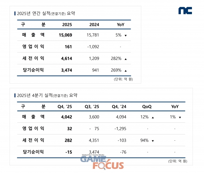 (주)엔씨소프트(공동대표 김택진, 박병무)가 2025년 4분기 및 연간 실적(연결기준)을 발표했다.