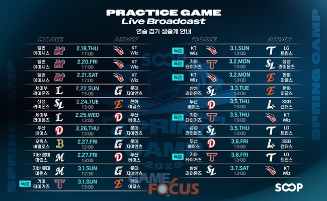 이번 스프링캠프 연습경기 중계에는 KIA 타이거즈, KT 위즈, 롯데 자이언츠, SSG 랜더스, 삼성 라이온즈, 두산 베어스 등 총 8개 구단이 참여한다. 경기는 호주와 일본 등 해외 전지훈련 현지에서 진행된다.