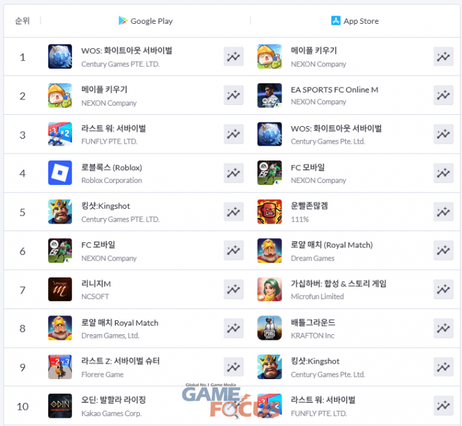 먼저 구글 플레이에서는 TOP 5 내에서 출시 이후 꾸준히 1위를 차지하고 있던 '메이플 키우기'가 '화이트아웃 서바이벌'에 1위 자리를 내줬다. '메이플 키우기'는 출시 이후 줄곧 견고하게 1위 자리를 지키고 있었으나, 어빌리티 오류와 공격 속도 관련 오류 그리고 원하는 이용자들을 대상으로 한 전액 환불 등 최근 연이어 발생한 이슈로 인해 21일 기준으로 3위까지 하락했다. 이외에는 '라스트 워: 서바이벌'과 '로블록스' 그리고 '킹샷'이 그 뒤를 이으면서 TOP 5를 형성하고 있다.