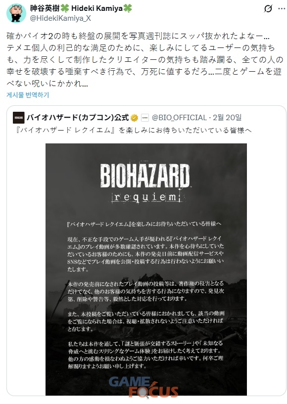 캡콤의 베스트 프렌차이즈 시리즈 ‘바이오 하자드’의 9번째 넘버링 타이틀 신작으로 기대를 모으고 있는 ‘바이오하자드 레퀴엠’의 유출과 관련해 ‘바이오하자드’, ‘역전재판’, ‘데빌 메이 크라이’, ‘베요네타’ 등 다양한 작품에 참여한 일본의 유명 개발자 카미야 히데키가 강도 높은 비판의 목소리를 냈다.