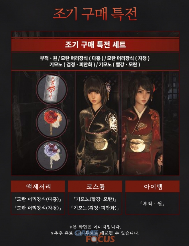조기 구매 특전은 세트로 제공된다. 악세서리 「모란 머리장식(다홍)」「모란 머리장식(자청)」, 코스튬 「기모노(빨강•모란)」「기모노(검정•피안화)」, 아이템 「부적•원」을 받을 수 있다.