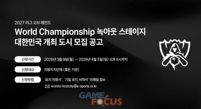 2027 LoL 월드 챔피언십 녹아웃 스테이지 개최에 관심 있는 지방자치단체는 오는 4월 5일(일) 오후 6시까지 공식 이메일(worlds-hostcity@e-sports.or.kr)을 통해 유치 의향서 및 관련 서류를 제출하면 된다. 이후 협회는 의향서를 제출한 지방자치단체를 대상으로 유치 제안서를 접수 받아 심사를 진행한 뒤, 올해 8월 중 최종 개최 도시를 선정할 계획이다. 자세한 내용은 한국e스포츠협회 홈페이지(e-sports.or.kr/)를 통해 확인할 수 있다.