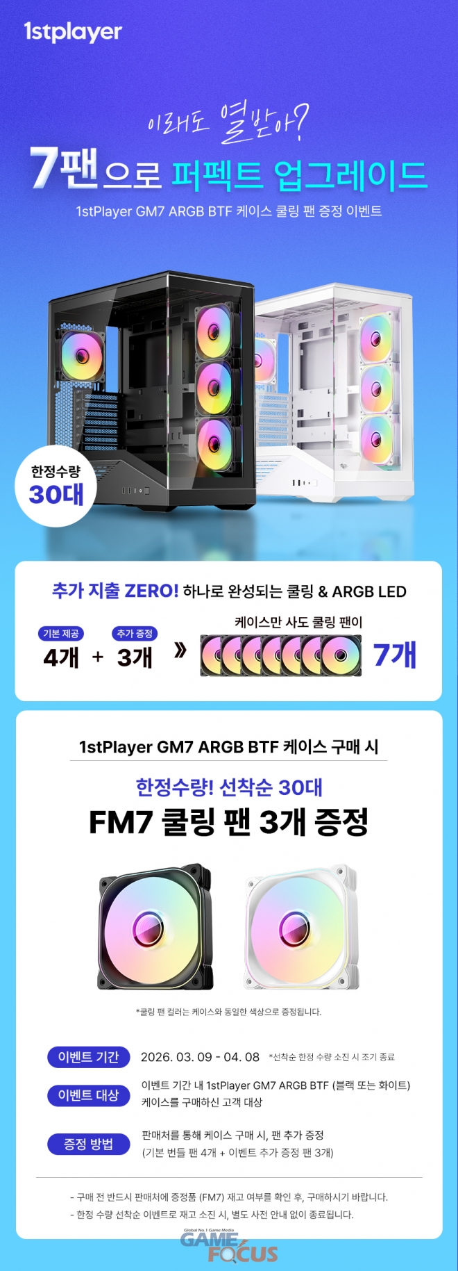 시소닉(Seasonic), 맥스엘리트(MAXELITE) 파워서플라이, 퍼스트플레이어(1stPlayer) 케이스, 할른지예(Halnziye) 써멀 컴파운드, 업히어(upHere) CPU 쿨러 등을 국내 시장에 공급하는 맥스엘리트(명재덕·양경훈 공동대표)는 2026년 3월 9일, 이벤트 기간 내 고급형 미들타워 PC 케이스, 1stPlayer GM7 ARGB BTF 케이스 구매 시, 기본 4개가 장착되어 있는 팬과 동일한 FM7 120mm ARGB 팬을 추가 3개 증정하는 이벤트를 진행한다고 밝혔다. 팬 3개 추가 증정 이벤트는 2026년 4월 8일까지 한정 수량, 선착순으로 진행되며, 구매 전, 반드시 판매처에 팬 재고 확인 및 이벤트 적용 여부 확인이 필요하다.