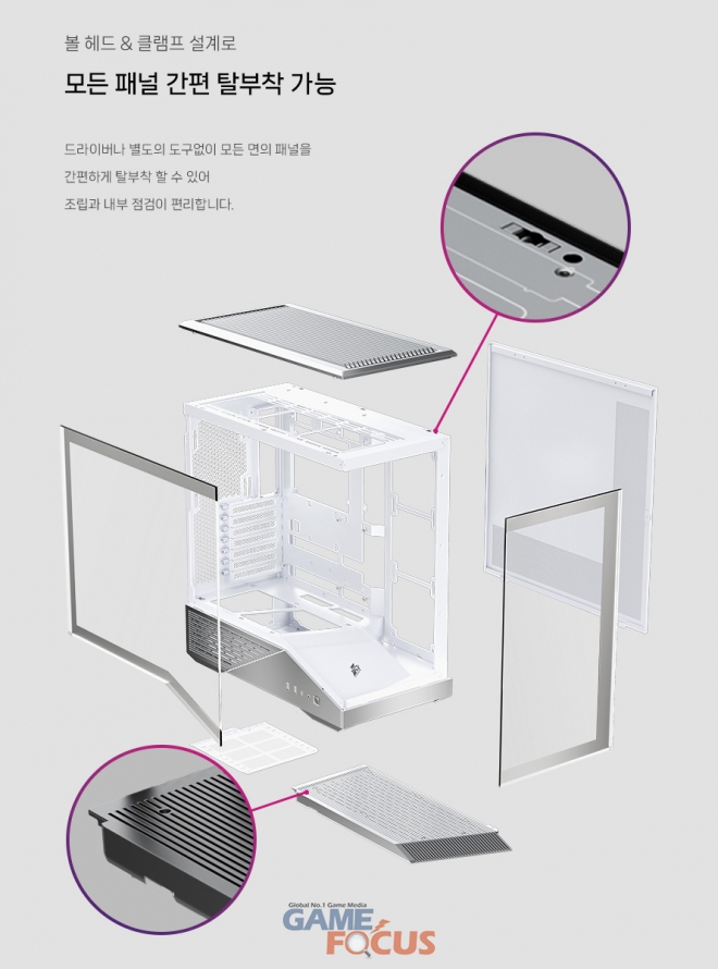최신 메인보드 레이아웃인 BTF 규격을 완벽하게 지원하여, 깔끔한 강화유리 디자인으로 시각적 임팩트까지 극대화했다. 볼 헤드, 클램프 설계로 모든 패널 탈부착이 간편하며, 튼튼한 하우징의 먼지 필터 설계로 장기간의 안정적인 냉각 성능을 유지할 수 있다.