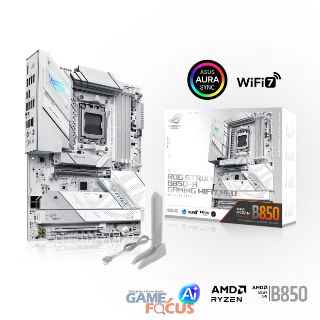 화이트 컬러 PC 시스템 구성을 위한 ROG Strix B850-A Gaming WiFi7 Neo는 세련된 화이트와 실버 컬러 조합의 외형을 가지고 있으며, I/O 패널에 Aura RGB 포인트를 두어 시각적인 즐거움을 준다. 14+2+2 전원부로 오버클럭에도 안정적인 전원 공급이 이루어지도록 설계되어 있다. PCIe 5.0 기반 M.2 슬롯 한 개와 PCIe 4.0 기반 M.2 슬롯 3개 구성으로 총 4개의 M.2 슬롯을 가지고 있으며, Supreme FX ALC4080을 통해 Dolby ATMOS를 지원해, 스피커와 헤드셋에 고음질의 사운드를 제공한다.